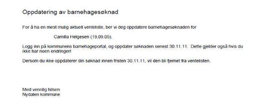 Når jobben er startet vil mottaker få melding om å logge seg inn og oppdatere sin søknad. Meldngen sendes som e-post eller brev, avhengig av hvilke innstillinger som er satt i meldingsregelen (dette er beskrevet ovenfor i denne guiden). Dersom "SvarUt" benyttes gjelder egne utsendelsesmåter.
