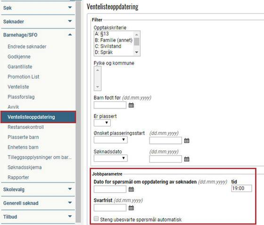 - Dersom det settes hake i feltet "Steng ubesvarte spørsmål automatisk", vil søknadene som er omfattet av ventelisteoppdateringen og som ikke er oppdatert innen fristen som settes, automatisk bli stengt. Det betyr at foresatte i så fall må søke på nytt