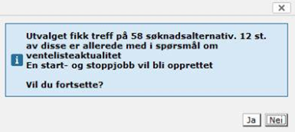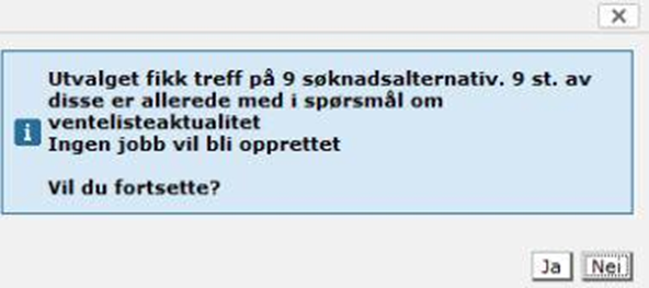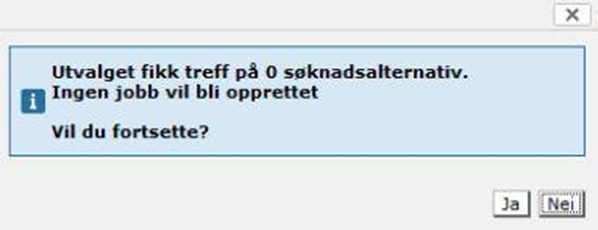 Det er viktig å se over slik at ønsket filter og parametre er valgt, da dette ikke kan endres etter at jobben er bestilt (satt igang). Jobben kan heller ikke slettes etter at den er bestilt (satt igang). Når du har satt ønsket filter/jobbparametre, trykk Neste. Merk at antallet som vises i meldingen som dukker opp er antall søknadsalternativer, ikke antall søknader. Dersom utvalget ikke gir noen resultater vises følgende melding: