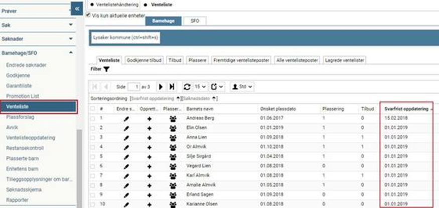 I Barnehage/SFO > Venteliste må kolonnen Svarfrist oppdatering hentes frem. Alle søknader på ventelisten som er omfattet av ventelisteoppdateringen vises med svarfristen som er satt i denne kolonnen: