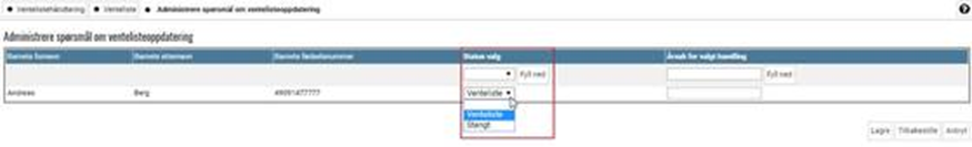 - Trykk på knappen Administrere ventelisteoppdatering for videre behandling av søknadene. Merk at det må være en dato i kolonnen Svarfrist dato for å kunne benytte denne manuelle behandlingen.