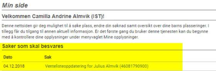 Når den foresatte logger inn har vedkommende fått en sak som må besvares: