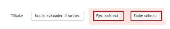 Når foresatte klikker på lenken visees informasjon om hvordan søknaden skal oppdateres. Klikk på Endre søknad for å oppdatere den, eller klikk på Fjern søknad for å slette den: