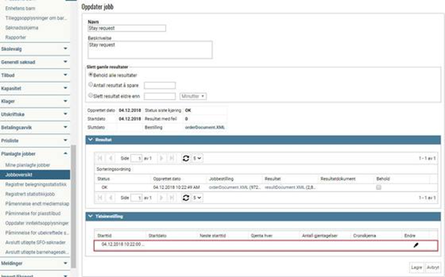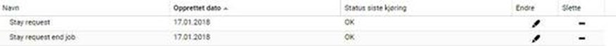 Når ventelisteoppdateringen er satt i gang vil det finnes to jobber under menypunktet Planlagte jobber > Mine planlagte jobber / eventuelt Jobboversikt: jobbene heter Stay request og Stay request end job: