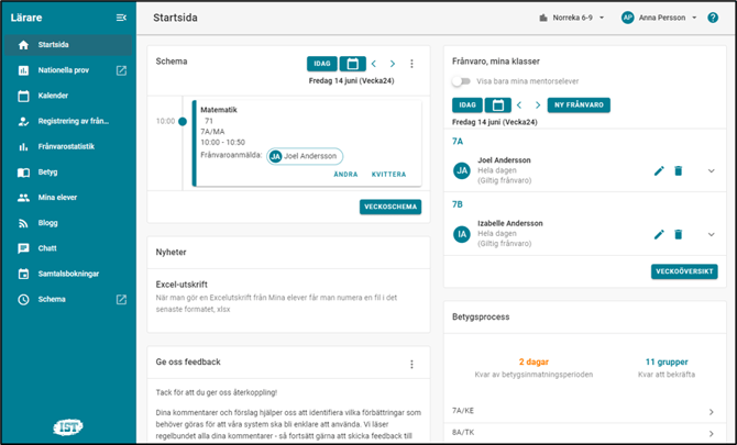 Så här kan det se ut när du som lärare loggar in i IST Administrations läraringång. Menyn på vänster sida innehåller de funktioner som används av din organisation och kan skilja sig från bilderna i den här handboken.