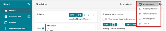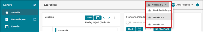 För att byta till en annan skolenhet klickar du på skolenhetens namn uppe till höger i fönstret. En lista med de skolenheter du arbetar på visas och du kan välja en annan skolenhet att arbeta med.