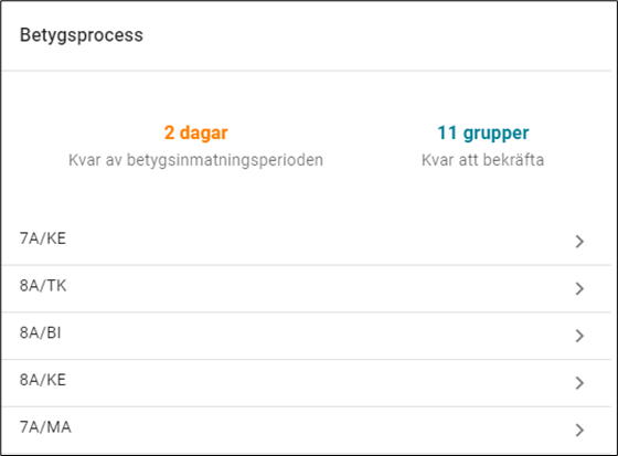 Det finns möjlighet för en administratör att lägga in en Betygsperiod som visar mellan vilka datum lärare kan registrera betyg. Om din skola använder Betygsperiod ser du som lärare på startsidan under Betygsprocess när det börjar närma sig betygsregistrering och hur många dagar som är kvar av betygsperioden. Där visas också de undervisningsgrupper som du är kopplad till där betyg ska registreras. Från den listan kan du klicka på en undervisningsgrupp och komma direkt till betygshanteringen.