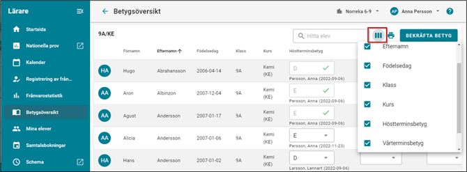 Du kan själv välja vilka kolumner du vill se i listan av elever. Om du enbart ska registrera betyg för yngre elever kan du exempelvis välja att inte visa kolumnen Slutbetyg. Via symbolen för skrivare kan du skriva ut listan med den information du valt att visa.