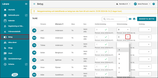 För att registrera ett betyg klickar du på pilen i kolumnen för Hösttermin, Vårtermin eller Slutbetyg utifrån vilken typ av betyg du ska registrera. De olika betygsstegen visas i en lista och du markerar det betyg i listan som du vill registrera på eleven. Allt sparas automatiskt. Man ser för varje betyg vilken lärare som registrerat betyget och när registreringen gjordes.
