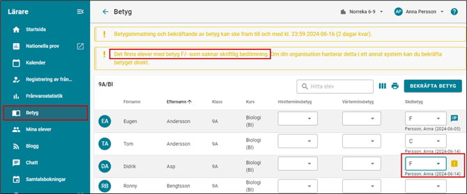 Om du registrerar betyget F eller ett streck (–) i kolumnen slutbetyg får du ett meddelande om att det saknas en skriftlig bedömning som ska bifogas slutbetyget.