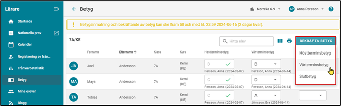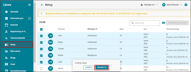 Klicka på knappen BEKRÄFTA BETYG och välj Höstterminsbetyg, Vårterminsbetyg eller Slutbetyg för att visa vilka betyg som ska bekräftas. Du kan sedan välja att bekräfta vissa elevers betyg eller alla elevers betyg i undervisningsgruppen. Markera de betyg du vill bekräfta och klicka på BEKRÄFTA längst ner.