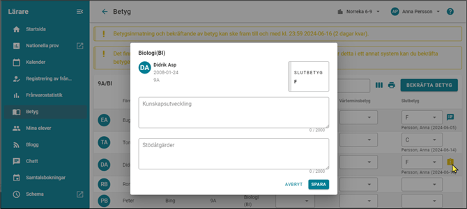 Klicka på den gula symbolen med utropstecken till höger om betyget och registrera elevens kunskapsutveckling och eventuellt stödåtgärder i ämnet. Den skriftliga bedömningen kommer automatiskt med som bilaga till elevens slutbetyg.