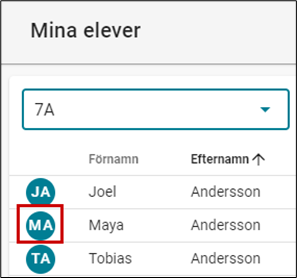 Under menypunkten Mina elever i Läraringången ser du alla elever som du är kopplad till, antingen via klass eller undervisningsgrupp.