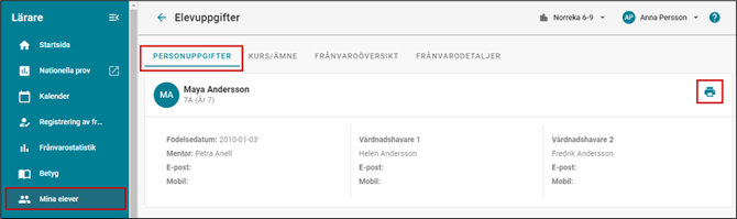 Här visas kontaktuppgifter till eleven och elevens vårdnadshavare.