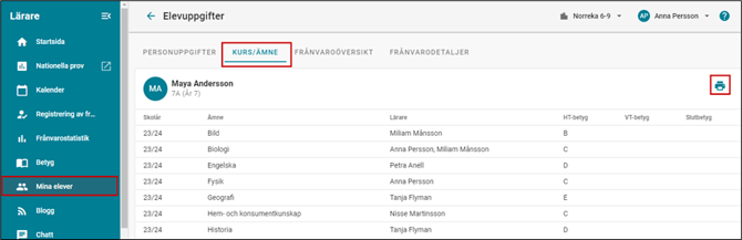 Här visas de ämnen eleven läser med information om undervisande lärare för varje ämne och registrerade betyg för varje termin om du är mentor. Om du är undervisande lärare för eleven ser du enbart de ämnen du undervisar i eller har undervisat eleven i.