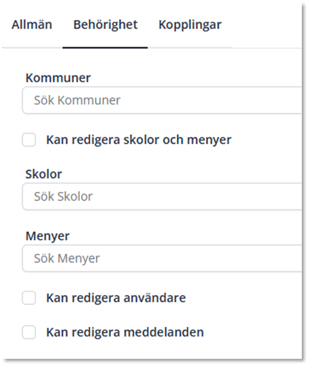 Här anger du vilka funktioner användaren ska ha tillgång till i Skolmaten. Behörigheter aktiveras genom att markera de alternativ som ska gälla.